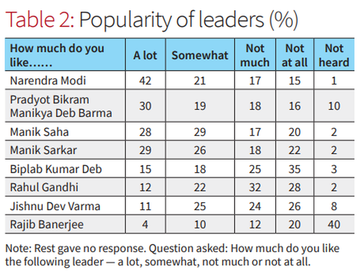 2014 से, प्रधान मंत्री नरेंद्र मोदी राज्य विधानसभा चुनावों में भाजपा के लिए एक प्रमुख प्रचारक रहे हैं। त्रिपुरा कोई अपवाद नहीं था। प्रधानमंत्री ने इस बार राज्य में प्रचार के लिए दो दिन बिताए। लोकनीति-सीएसडीएस पोस्ट पोल सर्वे बताता है कि त्रिपुरा में हर दस में से चार उत्तरदाताओं ने प्रधानमंत्री को बहुत पसंद किया, और हर पांच में से एक ने उन्हें कुछ हद तक पसंद किया। एक साथ लिया गया, यह उत्तरदाताओं के दो-तिहाई के करीब है, जो वास्तव में राज्य में भाजपा के नेतृत्व वाले गठबंधन के वोट शेयर से अधिक है। इस प्रकार राज्य में प्रधानमंत्री की लोकप्रियता पार्टी से कहीं अधिक है। यदि तथ्य यह है कि हर दस में से छह उत्तरदाताओं ने भाजपा के मुख्यमंत्री माणिक साहा को बहुत या कुछ हद तक पसंद किया है, तो “डबल-इंजन” नेतृत्व ने त्रिपुरा में भाजपा के नेतृत्व वाले गठबंधन को लाभांश दिया है (तालिका 2 देखें)।