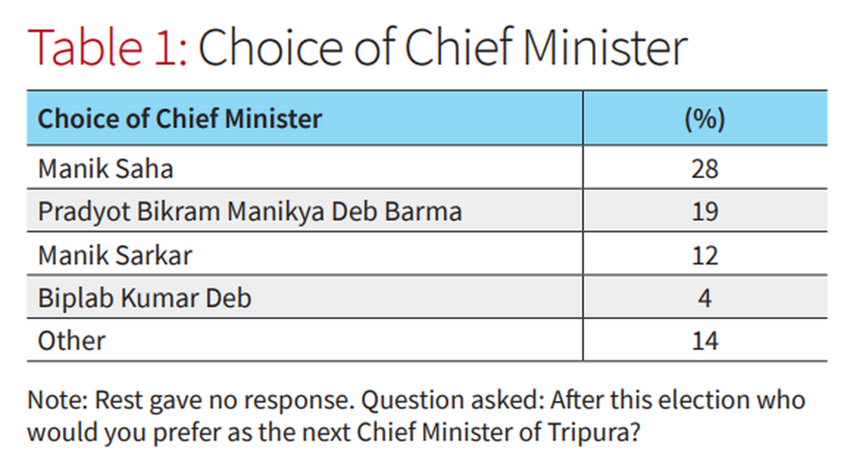 टिपरा मोथा नेता देब बर्मा की लोकप्रियता भी ध्यान देने योग्य है। करीब आधे उत्तरदाताओं ने उन्हें बहुत या कुछ हद तक पसंद किया। इस समर्थन का अधिकांश हिस्सा उस क्षेत्र तक ही सीमित लगता है जो उनकी पार्टी का गढ़ है। यह दर्ज करना भी उपयोगी है कि प्रत्येक दस उत्तरदाताओं में से चार उसे पसंद नहीं करते थे या उसके बारे में बिल्कुल नहीं सुना था।