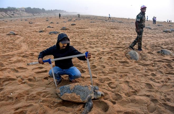 रिकॉर्ड के लिए: एक वन्यजीव अधिकारी एक ओलिव रिडले कछुए को नापता है, जो गंजम जिले के पोदामपेटा गांव के साथ समुद्र तट पर पहुंचा है।