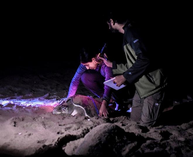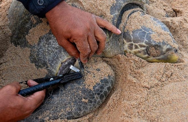 नज़र रखना: एक ओलिव रिडले कछुए को उसके प्रवास पथ की पहचान करने, समुद्री सरीसृपों के व्यवहार को समझने और संरक्षण प्रयासों के लिए उस ज्ञान का उपयोग करने में मदद करने के लिए टैग किया गया है।